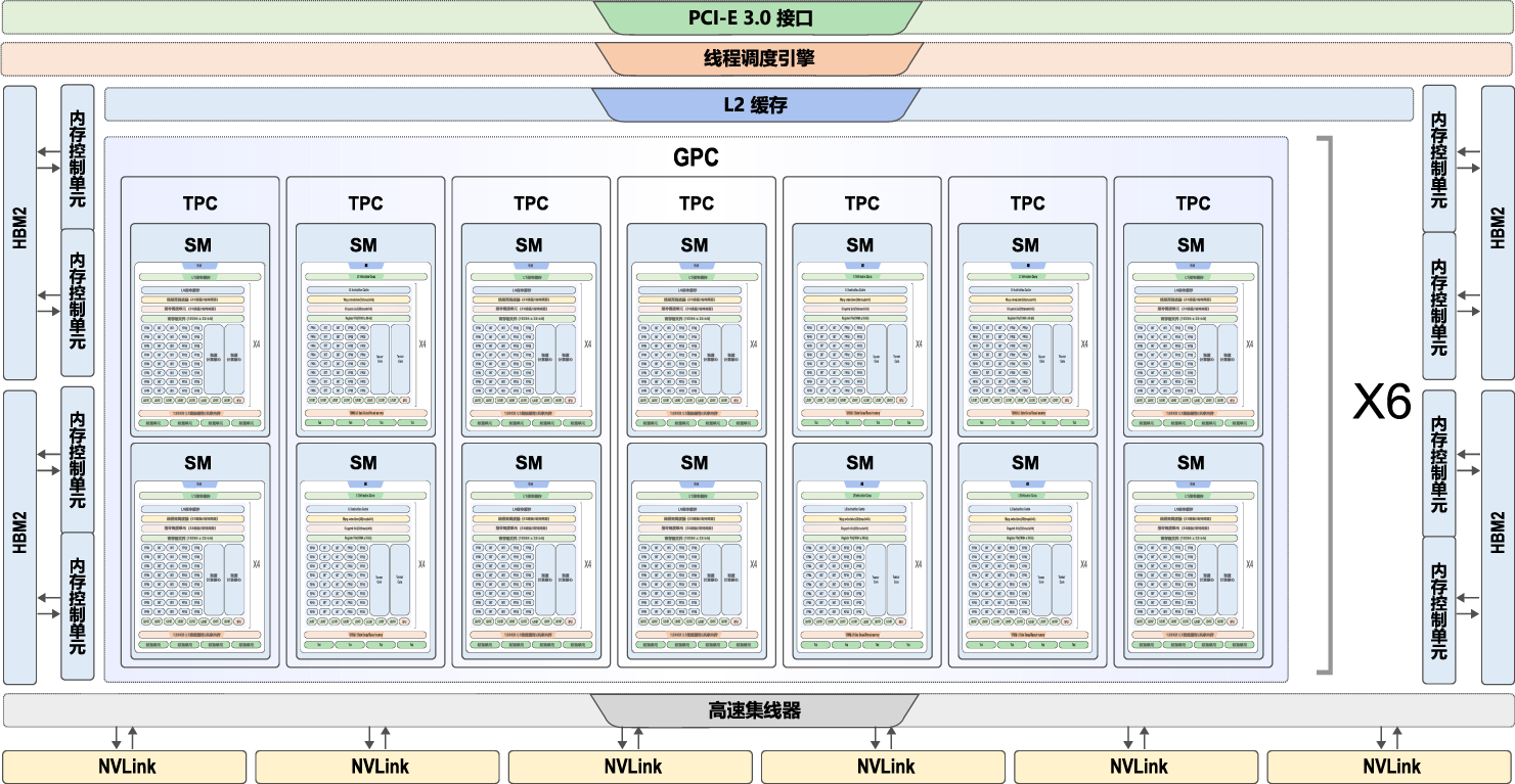 6个GPU处理集群(GPU Processing Cluster,GPC), 每个GPC含有: