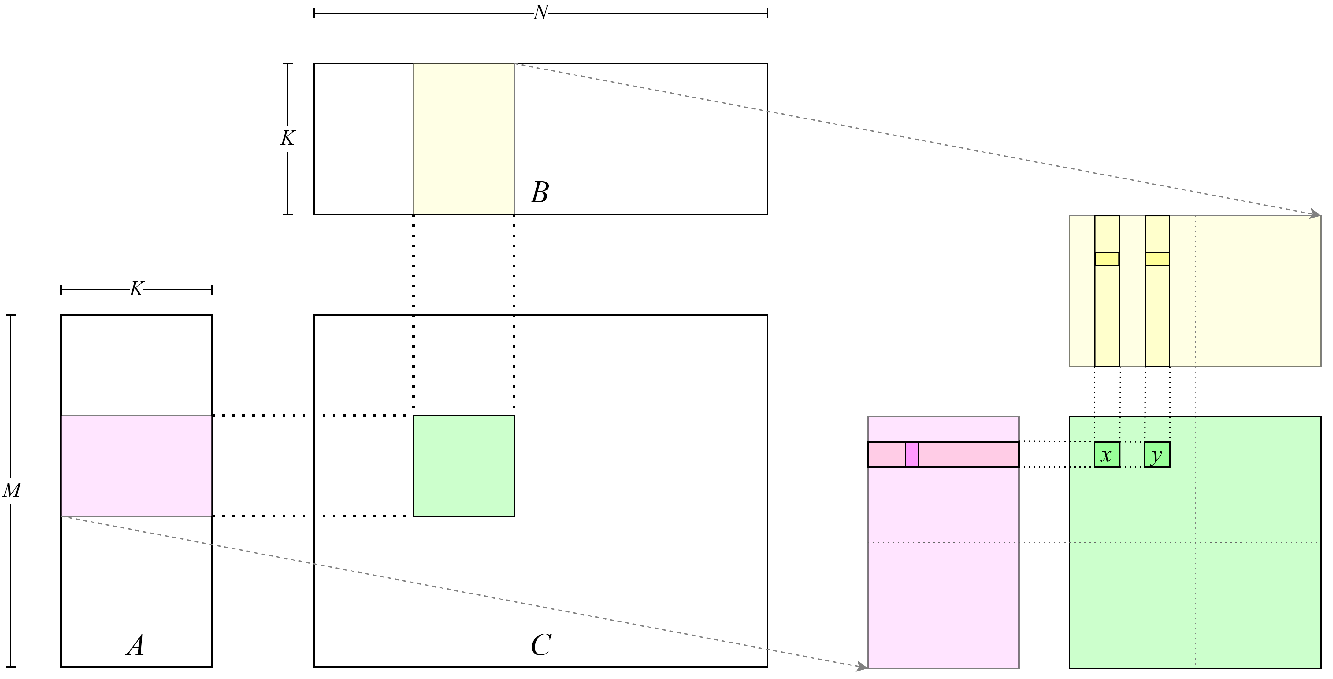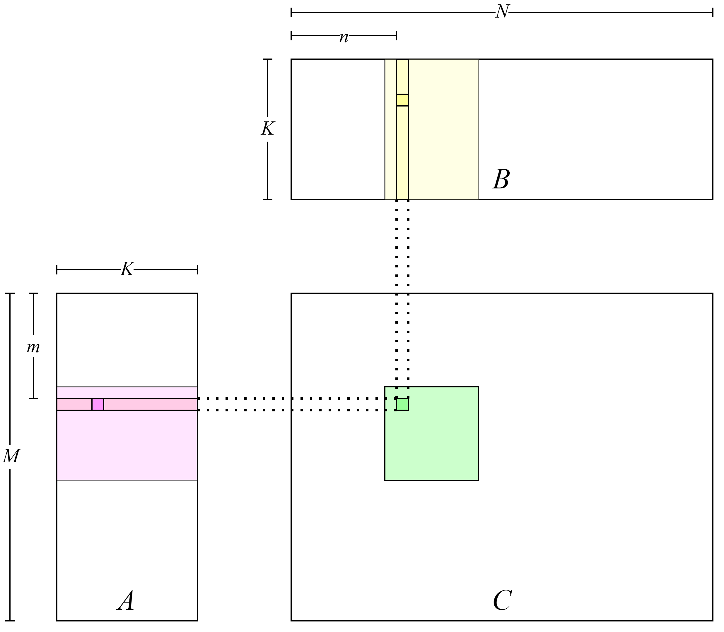 计算强度(Compute Intensity)指计算指令数量与访存指令数量的比值,在现代GPU中往往有大量计算单元但只有有限的访存带宽,程序很容易出现计算单元等待数据读取的问题,因此提高计算强度是提升程序性能的一条切实有效的指导思路。对于之前实现的GPU核函数,可以粗略计算其计算强度:在\(K\)次循环的内积计算中,对矩阵\(A\)与矩阵\(B\)的每次读取会计算一次浮点乘法与浮点加法,因此计算强度为1——两次浮点运算除以两次数据读取。之前的版本是每个线程负责处理矩阵\(C\)的一个元素——计算矩阵\(A\)的一行与矩阵\(B\)的一列的内积,可以通过使每个线程计算\(C\)更多的元素——计算矩阵\(A\)的多行与矩阵\(B\)的多列的内积——从而提升计算强度。具体地,如果在\(K\)次循环的内积计算中一次读取矩阵\(A\)中的\(m\)个元素和矩阵\(B\)中的\(n\)个元素,那么访存指令为\(m+n\)条,而计算指令为\(2mn\)条,所以计算强度为\(\frac{2mn}{m+n}\),因此可以很容易发现提高\(m\)和\(n\)会带来计算强度的提升。