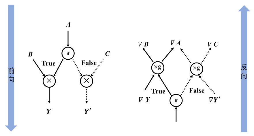 目前在主流的机器学习框架中,均提供图外方法和图内方法支持。鉴于前端语言控制流使用频繁为人熟知,为了便于理解控制流对前向计算与反向计算的影响,后续的讲解均使用图外方法实现控制流。常见的控制流包括条件分支与循环两种。当模型包含控制流操作时,梯度在反向传播经过控制流时,需要在反向梯度计算图中也构造生成相应的控制流,才能够正确计算参与运算的张量梯度。