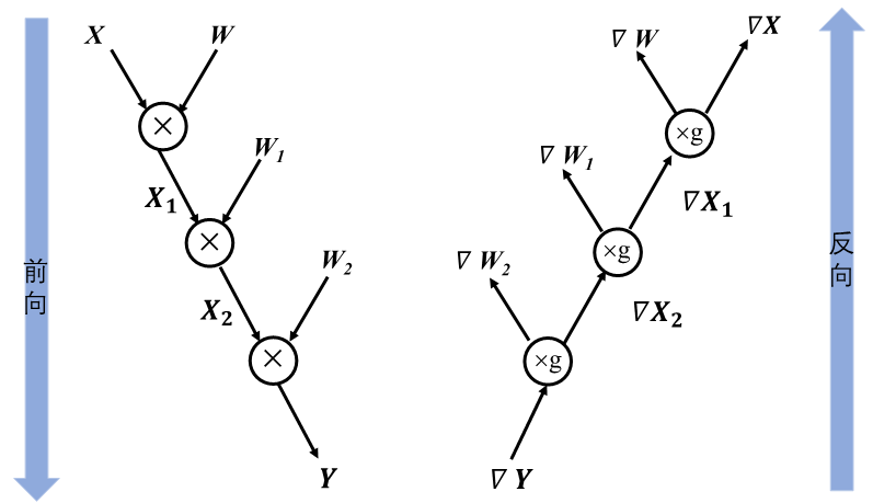 假设选取均方误差为损失函数,那么损失值是怎样通过链式法则将梯度信息传递给图中的 \(\boldsymbol{W}\) 和 \(\boldsymbol{W_1}\) 呢?又为什么要计算非参数数据 \(\boldsymbol{X}\) 和 \(\boldsymbol{X_1}\) 的梯度呢?为了解决上述两个疑问,要详细思考前向传播和反向传播的计算过程。首先通过前向传播来计算损失值三个步骤:(1) \(\boldsymbol{X_1}=\boldsymbol{XW}\) ;(2) \(\boldsymbol{Y}=\boldsymbol{X_1W_1}\) ;(3)Loss= \(\frac{1}{2}\) ( \(\boldsymbol{Y}\) -Label) \(^2\) , 此处Label即为标签值。