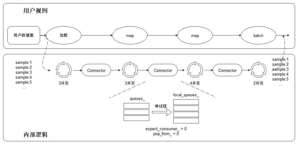 MindSpore通过约束算子线程组间的通信行为来确保对当前算子的下游算子的输入顺序与自己的输入顺序相同,基于这种递归的约束,确保了整个并行数据处理最后一个算子的输出顺序与第一个算子的输入顺序相同。具体实现中,MindSpore以Connector为算子线程组间的通信组件,对Connector的核心操作为上游算子的Push操作以及下游算子的Pop操作,我们重点关注MindSpore对这两个行为的约束。