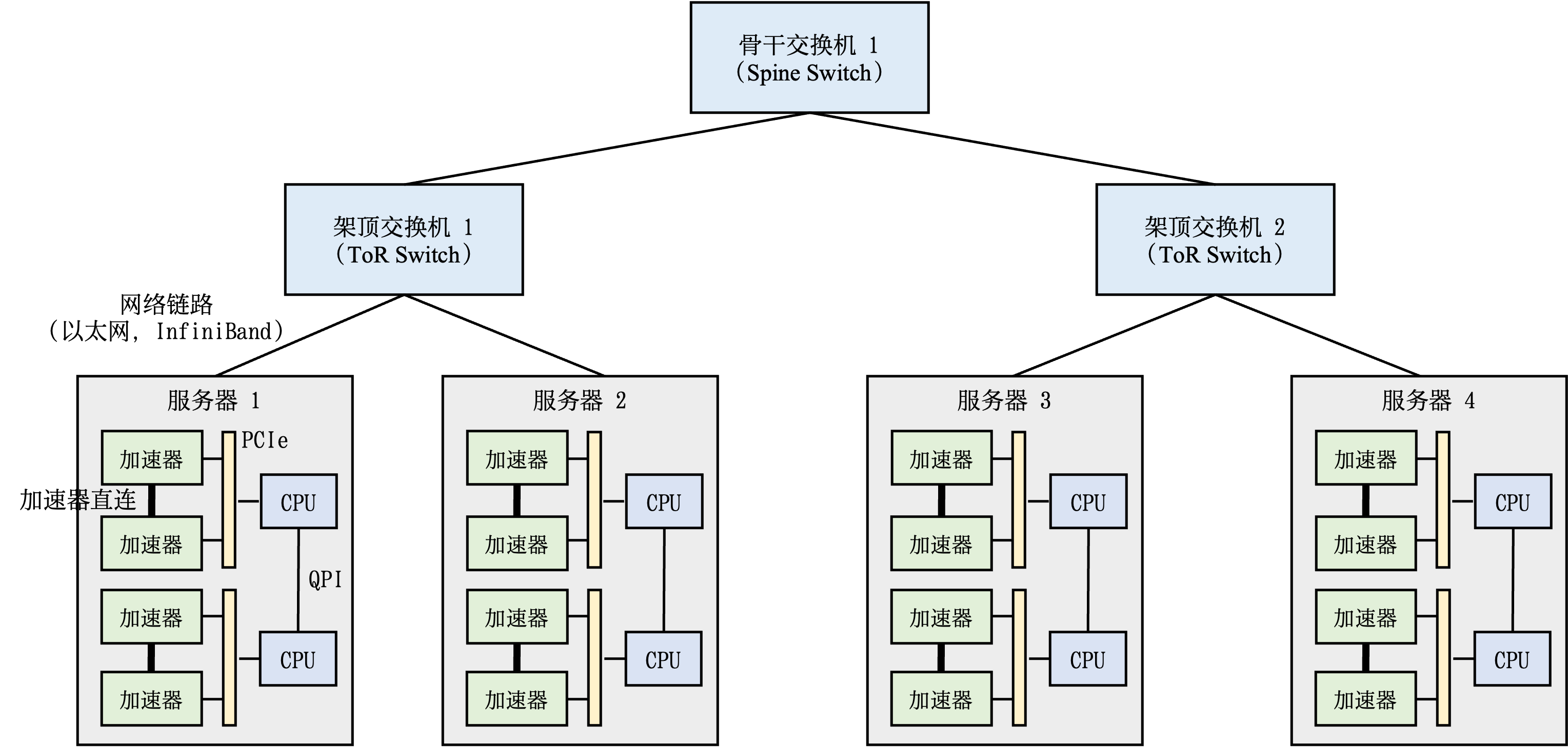 机器学习模型的分布式训练通常会在计算集群(Compute Cluster)中实现。接下来,我们将介绍计算集群的构成,特别是其集群网络的设计。
