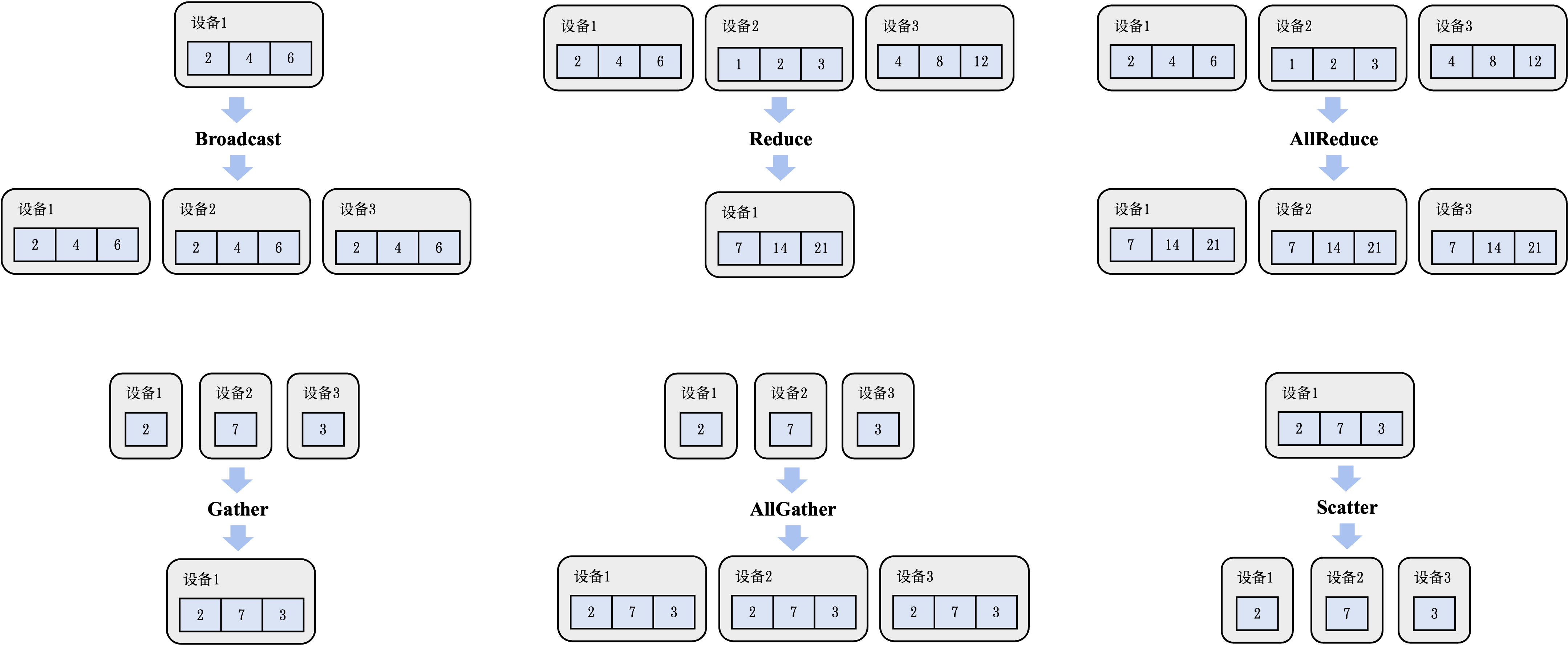 AllGather算子会把收集的结果分发到全部的设备上。 图11.5.1展示了设备1,设备2和设备3共同调用AllGather的初始和结束状态。