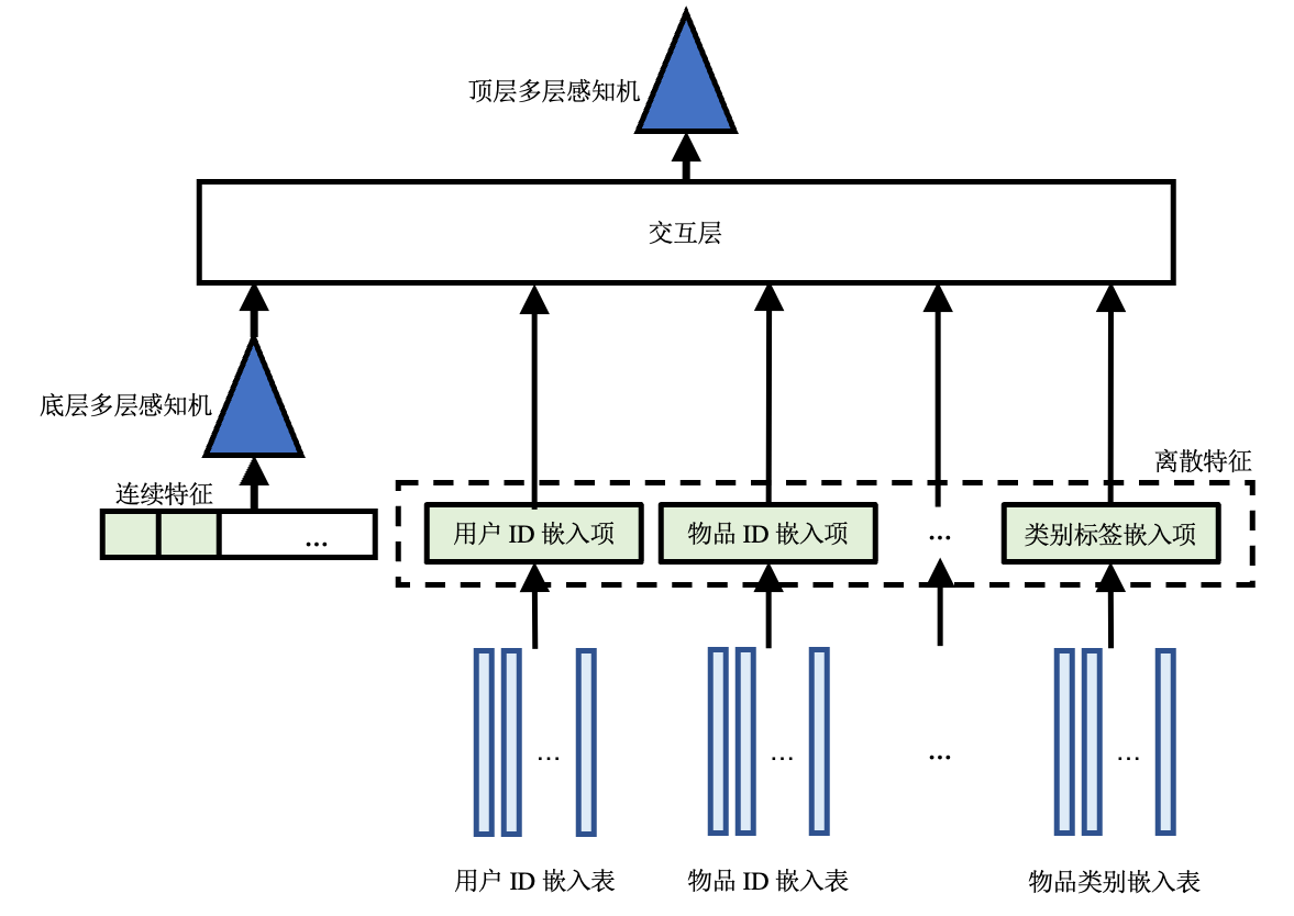 和双塔模型类似,DLRM首先使用嵌入表将离散特征转化为对应的嵌入项(一条稠密向量),并将所有连续特征连接成一个向量输入底层MLP,处理得到与嵌入项维度相同的一个向量。底层MLP的输出和所有嵌入项一同送进交互层进行交互。