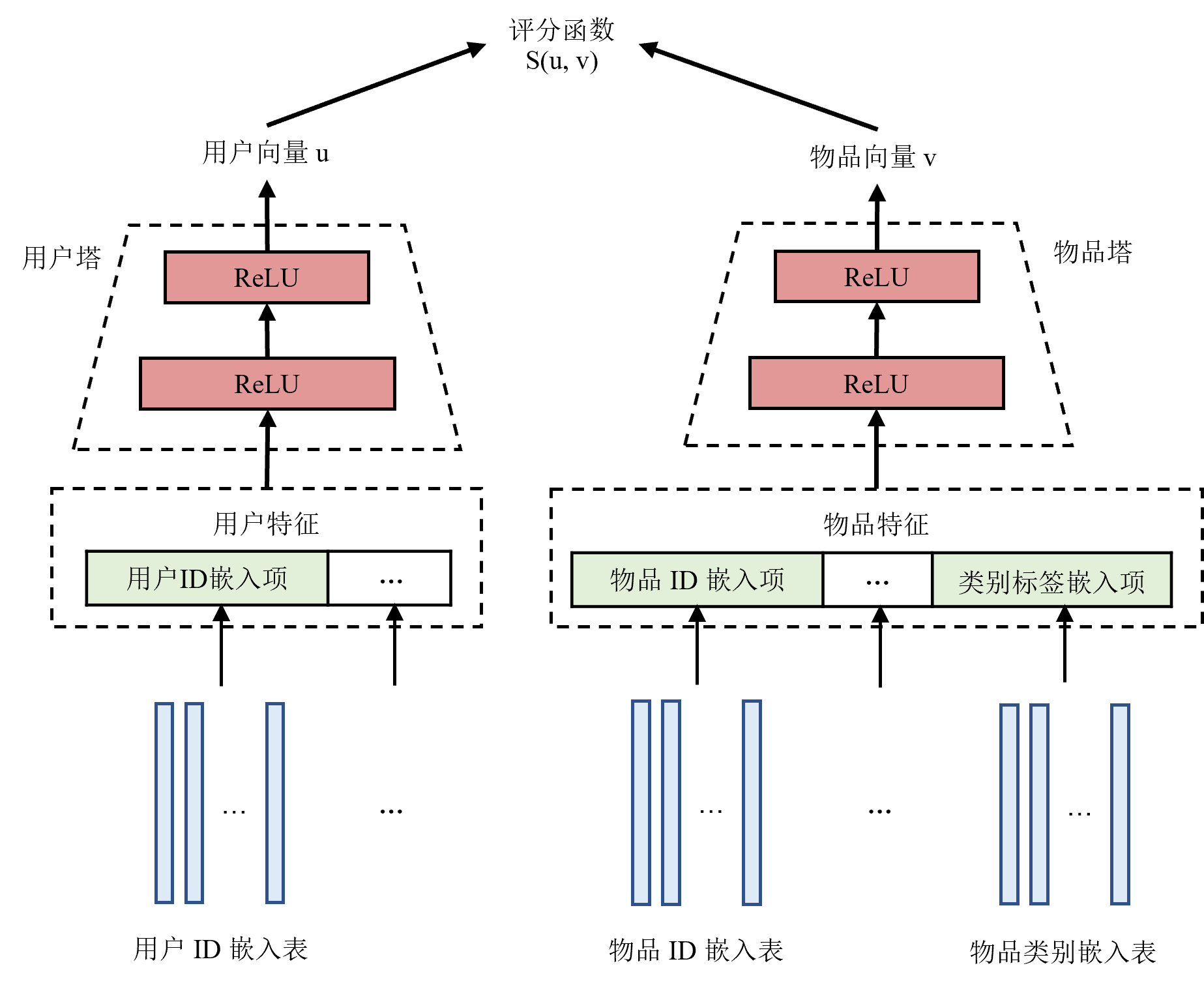 接下来以如图 图13.2.2所示双塔模型 [Yi et al., 2019]为例介绍召回的流程。双塔模型具有两个MLP,分别对用户特征和物品特征进行编码,称之为用户塔 1 和物品塔。对于输入数据,连续特征可以直接作为MLP的输入,而离散特征需要通过嵌入表映射为一个稠密向量再输入到MLP中。用户塔和物品塔对特征进行处理得到用户向量和物品向量用于表示不同用户或物品。双塔模型使用一个评分函数衡量用户向量和物品向量之间的相似度。