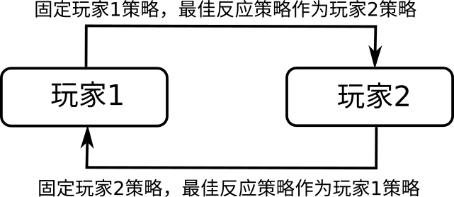 我们在上面这个例子中采用的学习方法其实是多智能体强化学习中最基础的一种,叫自学习(Selfplay),如 图15.3.1 所示。自学习的方法即固定当前玩家 1 的策略,按照单智能体优化的方法最大化一侧智能体的表现,所得策略称为最佳反应策略(Best Response Strategy)。之后再将这一最佳反应策略作为玩家 2 的固定策略,再来优化另一边的智能体策略,如此循环。我们可以看到自学习在特定的任务设置下可能无法收敛到我们想要的最终目标。正是由于多智能体学习过程中有类似循环结构的出现,我们需要更复杂的训练方法,和专门针对多智能体的学习方式来达到我们想要的目标。