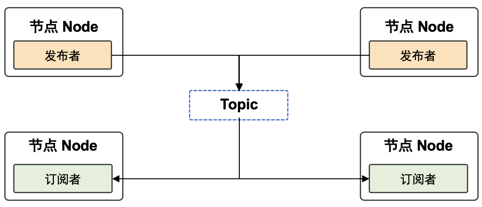 ROS2将复杂系统分解为许多模块化节点。主题(Topics)是 ROS Graph的重要元素,它充当节点交换消息的总线。如 图17.2.3 所示,一个节点可以向任意数量的主题发布数据,同时订阅任意数量的主题。主题是数据在节点之间以及因此在系统的不同部分之间移动的主要方式之一。